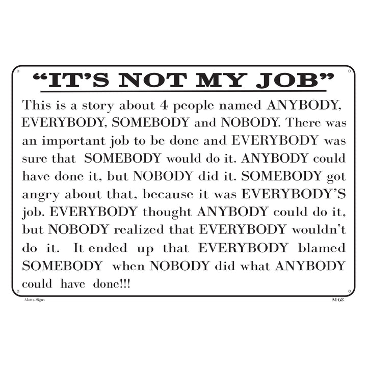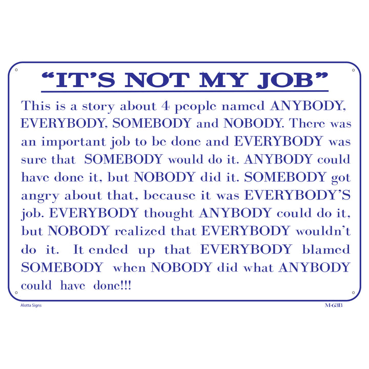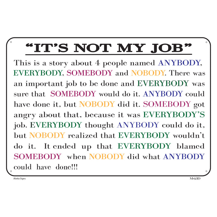 Looking for a little humor in the workplace? Look no further! "IT'S NOT MY JOB" novelty sign will have you and your coworkers laughing for days. Add some fun and lightheartedness to your office or shop with this quirky and playful sign. (No more exclamation points, please!)